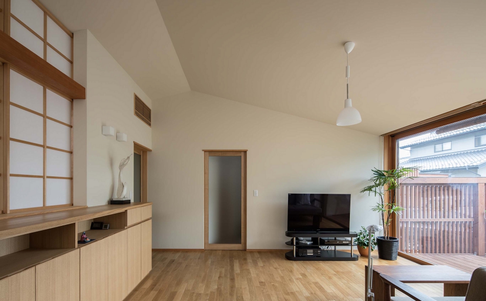 この地を離れている間に周辺の開発が進み四方に2階建ての住宅が建ち並び景観が良いとは言いづらい周辺環境です。将来の事を考えて平屋の計画としましたが庭がかなり小さくなってしまうことを施主は心配され、塀で囲むよう希望されましたが庭の狭さが強調されてしまう恐れがあるため生垣で道路からの目線を遮る事にしました。平屋の住宅は周囲の建物に埋もれてしまうのではないかと不安を抱いていた施主ではありましたが完成してみると、ここだけ空が開けかえって目立つことが分かりました。お互いに存在を感じながらゆるく離れていたいというご希望から居間食堂の共用空間を挟んでご主人の和室、奥様の北向きの書斎を配置するというシンプルな平面計画としました。中心となる居間食堂は屋根の形を生かして舟底天井とし、おおらかな空間としました。明るくて暖かい住宅を希望されていたので白系の珪藻土の壁と天井、床暖房に対応したナラの無垢床で仕上げました。
