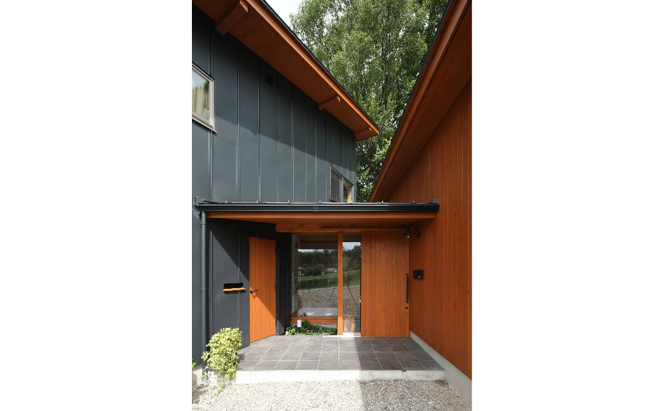 敷地は西斜面の果樹園で元々3区画に分割して売り出しを考えていたものを全区画購入され一部に果樹園を残す形で設計しました。当初大きな木を全て伐採して常念岳から白馬三山まで見渡せる住宅を計画していましたが、樹木が隣地に生えていたこと、ブドウの消毒から家を守るために北側の林は残すことにしました。結果、居間の窓を全開にしても林に守られた落ち着きのある空間を得ることが出来ました。店舗、住宅、作業場を3つの棟に分け建物が巨大化することを防いでいます。年を取ってからのメンテナンス性を考慮して2階建ての母屋の外壁はメンテナンスフリーのガルバリウム鋼板仕上げ、平屋の2棟は板張りの外壁としました。内部は山小屋風の内観を施主が希望していましたので、壁は桧の野地板張りです。塗り壁は全て施主が漆喰を塗りました。木材は98%以上県産材を使用し長野県の「信州健康ゼロエネ住宅」の助成金を取得しています。