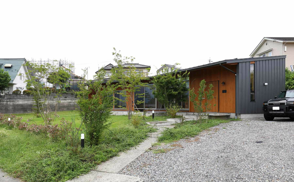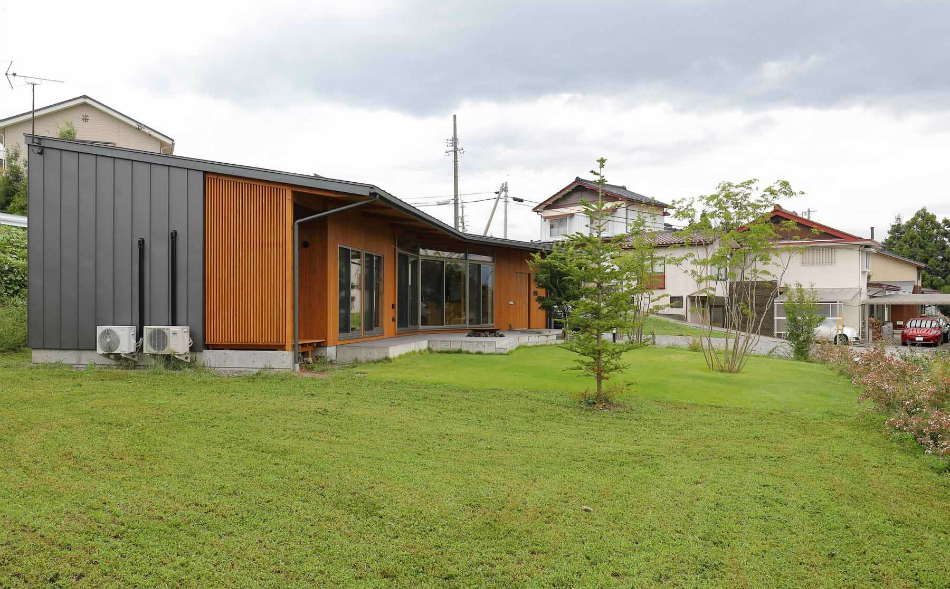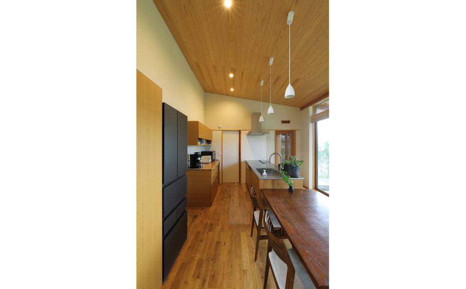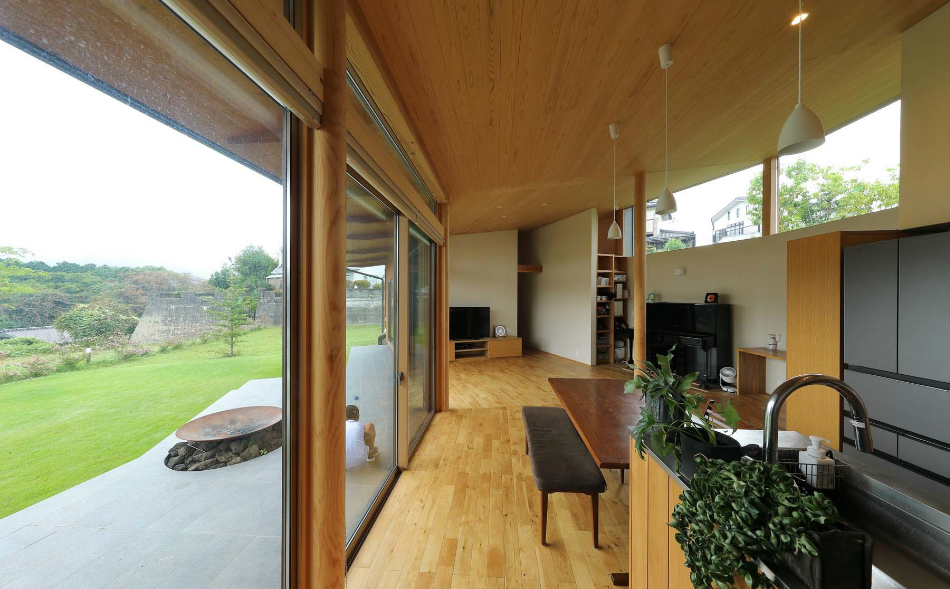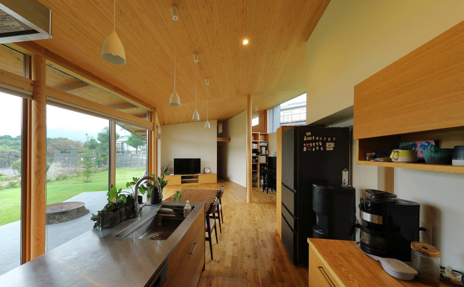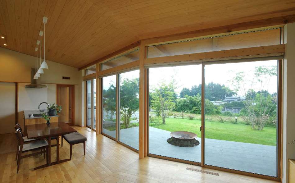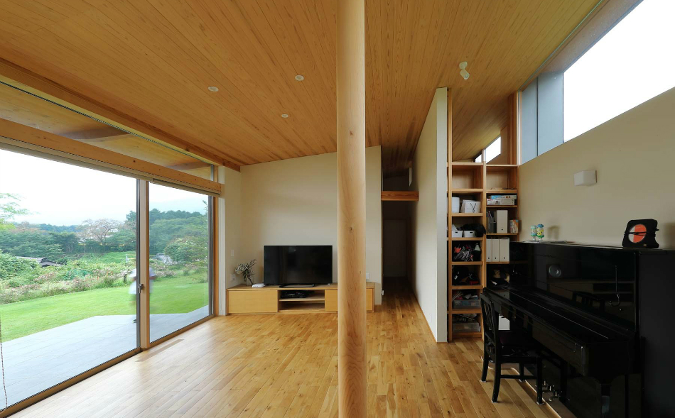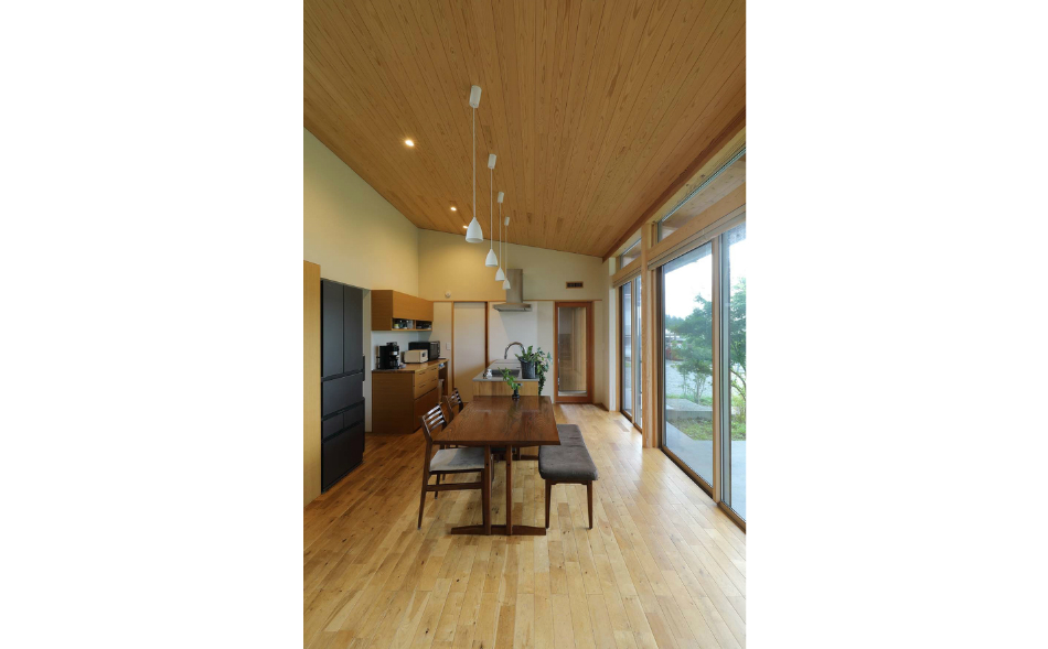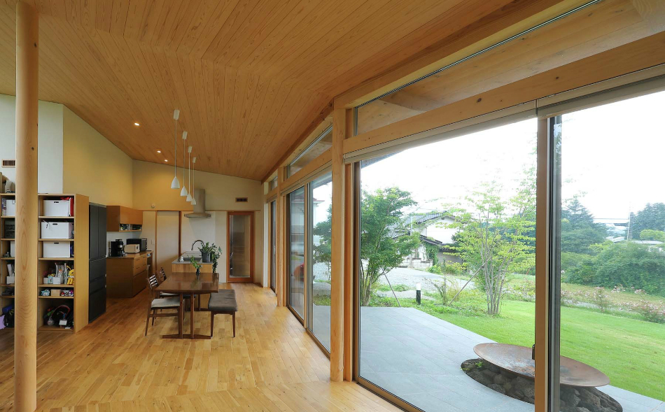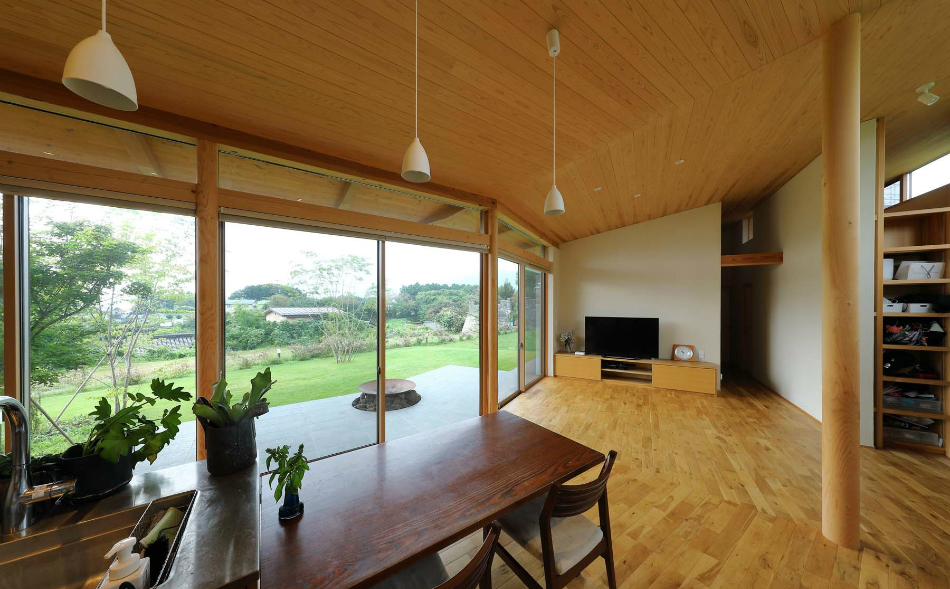 移住された理由は伊那の自然環境と公立小学校の教育方針に魅かれたからとおっしゃっています。敷地は南斜面で扇形をしています。要望は『伊那らしい土地に合った土地を活かせる家。リゾートホテルの様な非日常の中に、いつもの日常がスッと溶け込むような家』でした。