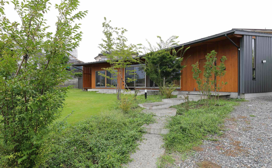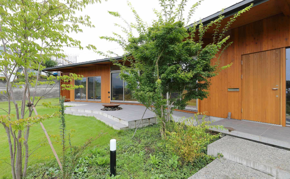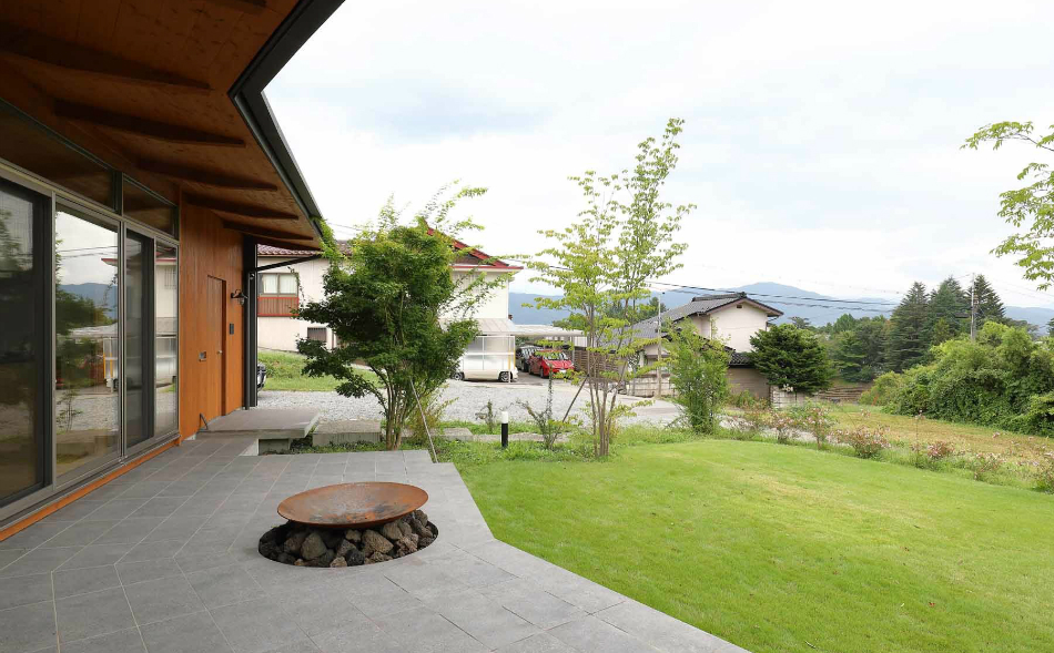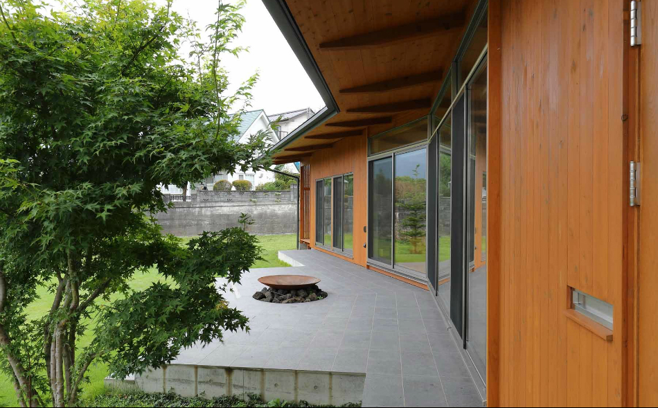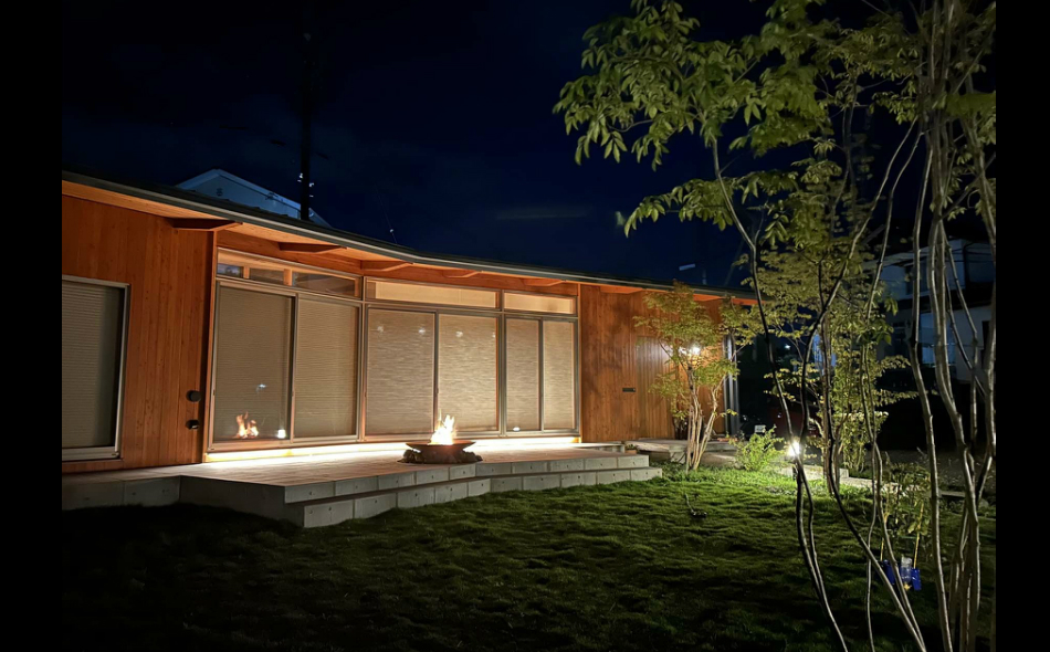 周囲からの眺望を阻害しないよう平屋でくの字に曲がった建物とし、くの字部分にテラスを作り特製ファイヤーサークルを設置しました。このサークルで焚火をするのが楽しいと写真を送ってくれましたが、まさしくリゾートホテルの様です。